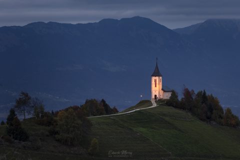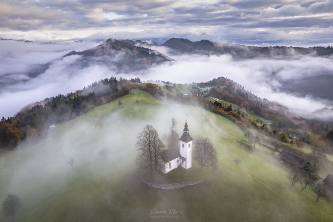 Reservamos la sensibilidad del paisaje tranquilo de las colinas de Skofja Loka con la iglesia de Santo Tomás como elemento estrella para nuestra fotografía de atardecer.