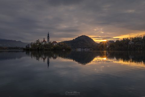 Atardecer en el lago de Bohinj, donde seguiremos encontrando enclaves fotográficos preciosos en el entorno de Iglesia San Juan Bautista.