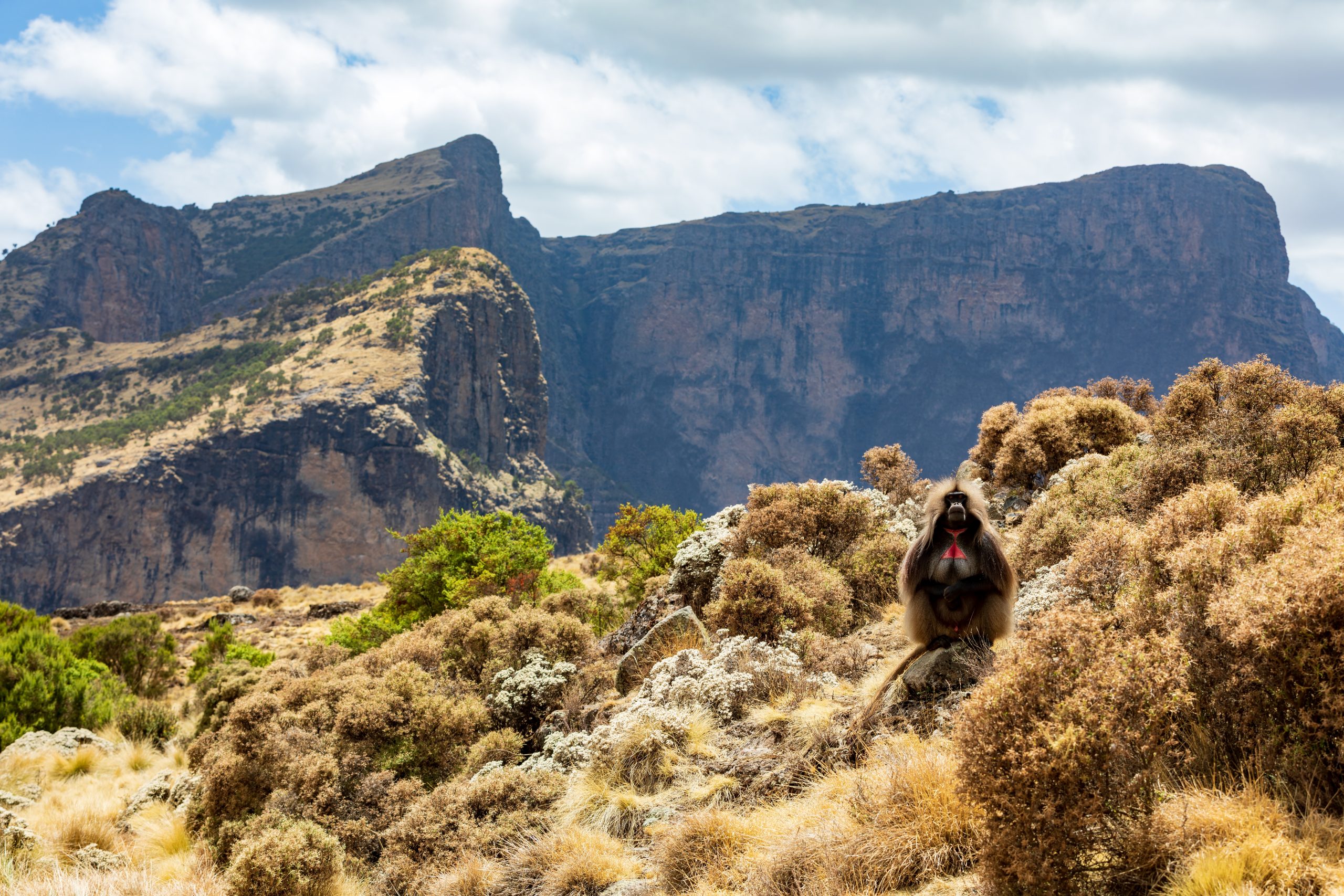 El Parque Nacional de las Montañas Simien, en el norte de Etiopía, es un entorno exótico con una fauna única y vistas impresionantes en un paisaje modelado por la naturaleza, donde la erosión masiva durante millones de años ha creado montañas escarpadas. Las Montañas Simien se formaron hace unos 30 millones de años, o incluso más. Los profundos valles y la alta meseta se crearon debido a la explosión volcánica de roca basáltica, que transformó los acantilados escarpados de las montañas y, posteriormente, la erosión los convirtió en un espectacular paisaje de valles de hasta 1500 metros de profundidad. Los acantilados son el mejor lugar para ver tanto al endémico y elegante ibice etíope y al babuino gelada.