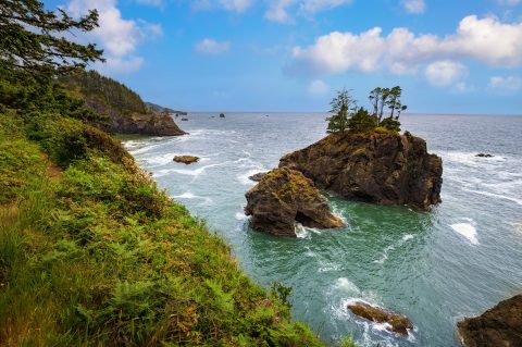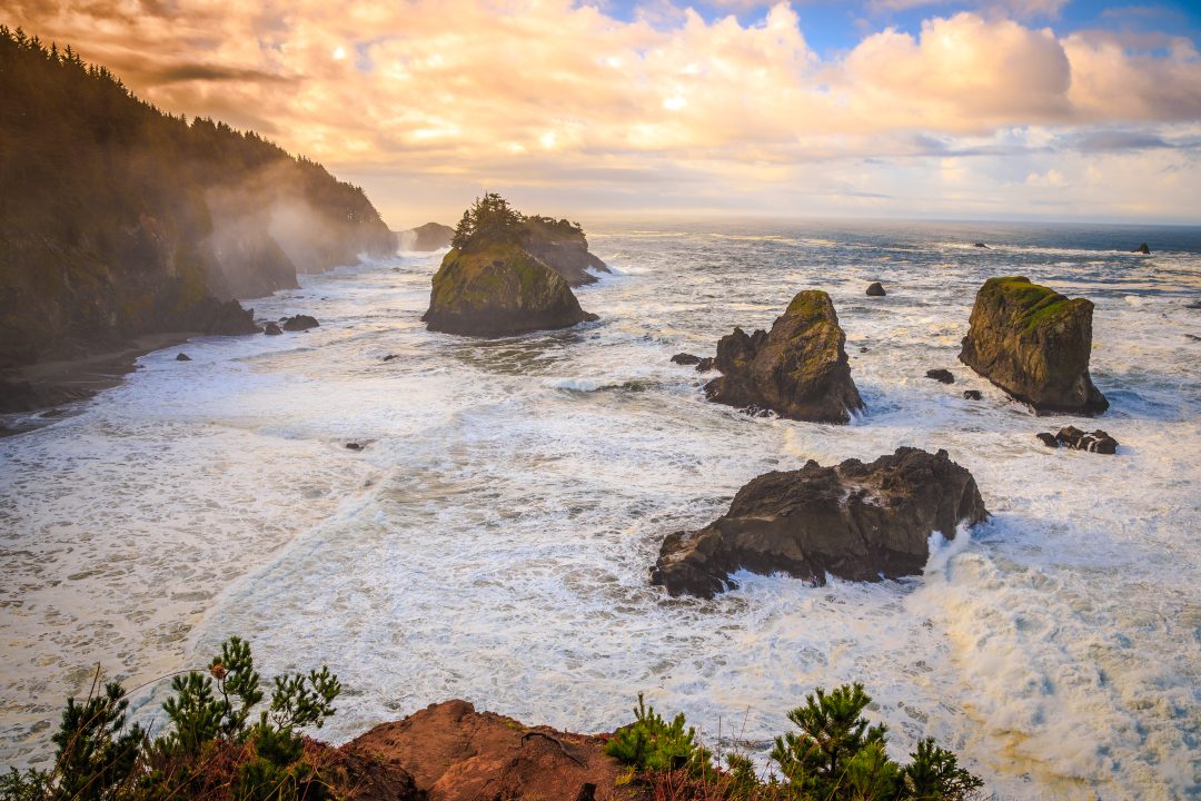 Costa salvaje de Oregón con miradores como **Natural Bridges**, **Secret Beach** y **Arch Rock**. Otoño: olas más dramáticas y cielos limpios tras frentes.