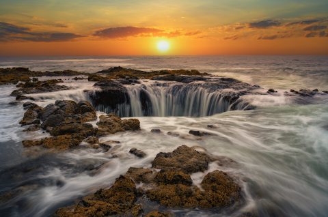 Parada en **Thor’s Well** (marea y oleaje seguros) y llegada a **Cannon Beach** (haystack rock) para el atardecer.